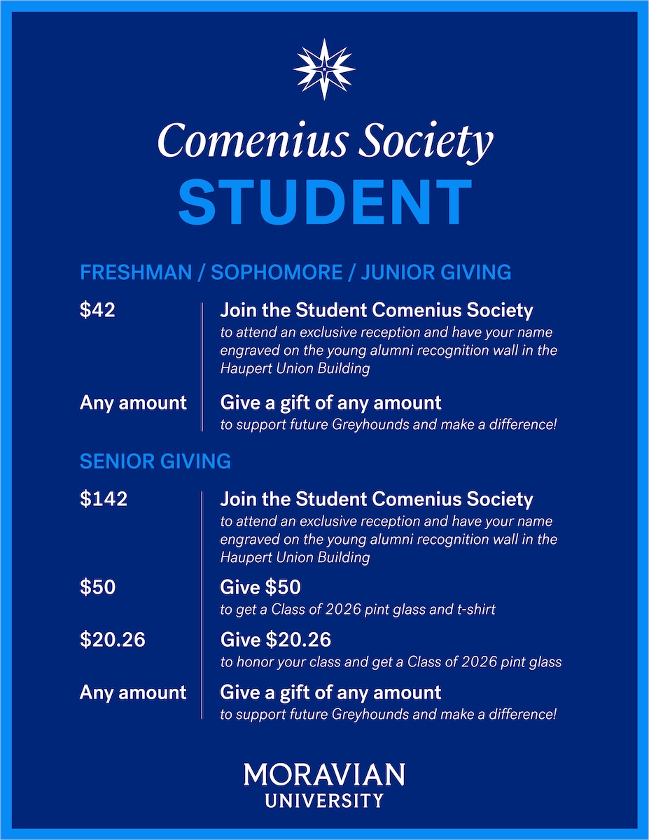 Any freshman, sophomore, or junior who gives $42 (as in 1742!) to Moravian, and any senior who gives $142, earns student membership in the Comenius Society. The Comenius Society comprises alumni, families, faculty/staff, students, and friends who carry on John Amos Comenius' visionary belief that education should be accessible to all, regardless of gender or social standing. Through their generous giving, Comenius Society members help advance this mission of innovation and inclusion, sustaining Moravian's legacy of educational excellence. Student members will receive invitations to special recognition and networking events, a social media shout-out, and recognition on digital monitors across campus.