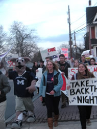 "Take Back the Night" is a march and rally which encompassed a three-day program that advocated against all forms of violence within the Bethlehem and Moravian University communities by showcasing students, staff, and local groups' testimonies. The event was sponsored by many local and collegiate groups with common anti-violence interests, including the AAUW Bethlehem Branch, the Women's, Gender and Sexuality Studies Department, the Office of Student Assistance, the Women's Basketball Team, Moravian University's Active Minds, Amnesty International, Business and Economics, Psychology, Psi Chi, and Spectrum clubs.