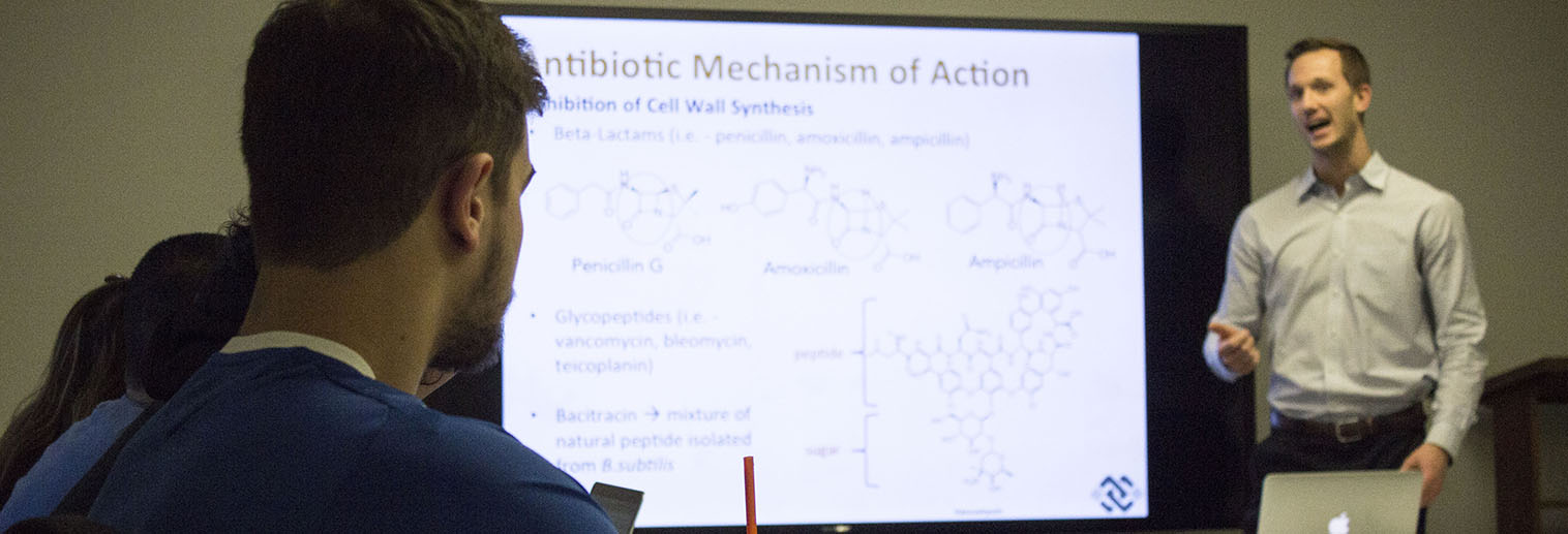 After the contributions from Moravian, Lehigh, Muhlenberg, Lafayette, DeSales, and Cedar Crest were compiled at the end of the summer, Bertucci employed the expertise of all six professors in a new course at Moravian entitled Bioorganic & Medicinal Chemistry. The course was taught using a “flipped classroom” approach, in which students viewed one of the pre-recorded modules outside of class and participated in a variety of related guided activities in class to encourage active learning and student engagement. The result: a look into the chemistry behind how pharmaceuticals are designed, how they work, and the diseases and conditions for which new treatments urgently need to be discovered. Junior Robert Hillman recounts one of his favorite in-class activities relating to a module on NSAIDs (Non-Steroidal Anti-Inflammatory Drugs), in which each student was assigned a different NSAID to research and then present to the class: “I thought that was the most interesting activity. I got to see the receptors [for the NSAIDs] and it reinforced the theory we learned regarding their mechanism of action.”