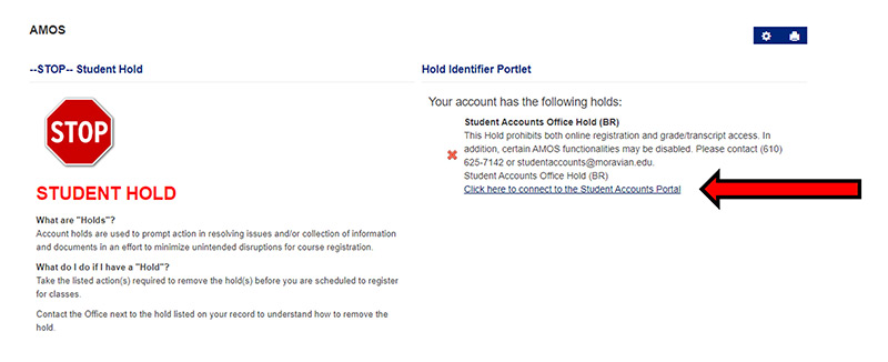 If you or your student has a HOLD, there will still be a link available to click on that will enable you to make a payment. Please read the messaging associated with your hold, and click the link to enter the Student Accounts Portal.