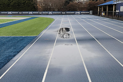 In lane two on the homestretch, after any rain, the track has substantial pooling that lasts for at least 24 hours. Before meets, the team uses a leaf blower to get rid of the pools. Leveling the track will allow for proper drainage.