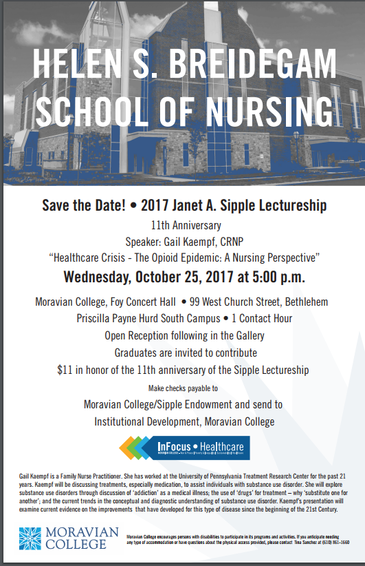 Kathy Gray, DNP, FNP-C, the recipient of the TLC grant, will be introducing Diana C. Dolan, Ph.D., CBSM, a clinical psychologist with the Center for Deployment Psychology at the Uniformed Services University of the Health Sciences, will present on “Behavioral Health Concerns in Military-Connected Patients: An Overview for Civilian Primary Care Providers.” This training is intended for civilian Primary Care medical providers and their staff treating Service members, veterans, and family members. The purpose of the training is to educate providers regarding how to better identify these military-connected patients, provide basic information regarding military culture and review military-specific factors that may impact medical care, behavioral health and functioning. An overview of common deployment-related conditions such as PTSD, TBI, insomnia and depression will be presented as well as useful screenings and treatment resources and referral options. RSVP encouraged: yergerl@moravian.edu, 610-625-7987.