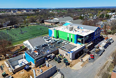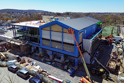 During the fall semester, plumbers and electricians will be installing infrastructure under the concrete slab, sections of the second-floor concrete slab will be poured, and steel erection will begin for the addition. Crews have worked hard through summer preparing the site and pouring the footings and foundations that will support the new building. There is a new temporary parking lot at the corner of Monocacy and Laurel streets for contractor parking and material storage.