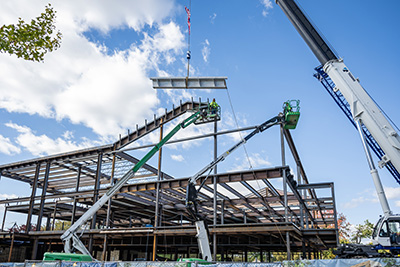 Construction crews are working to erect the steel framing of the building, according to Amber Donato, Associate Director of Project Management. Next, heading into winter, they will focus on pouring concrete floor slabs, exterior wall framing, and putting on the roof.