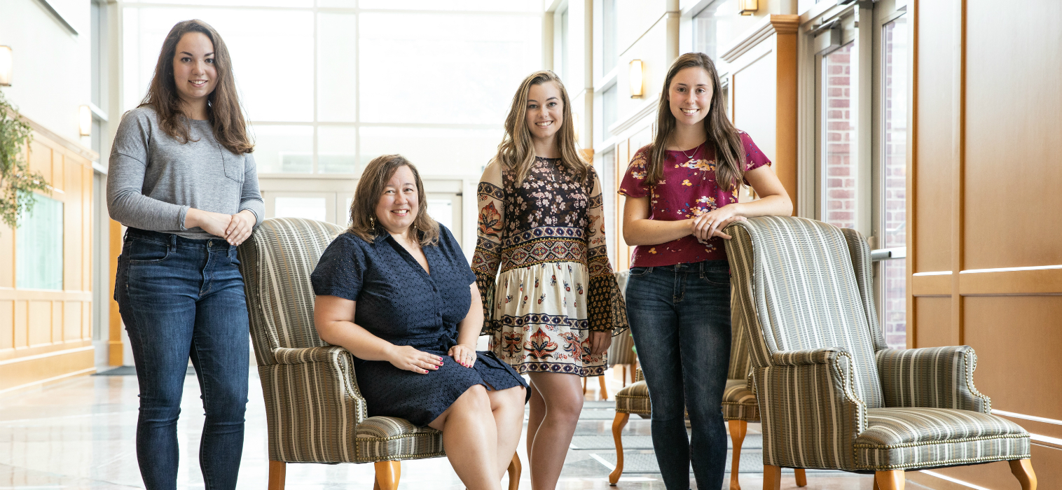 Amy Howard (seated) visits with former Kutztown Area High School students who now attend Moravian (from left to right): Michaela Ryan ’21, Krista Kunkle ’20, and Rachael McCoach ’22.