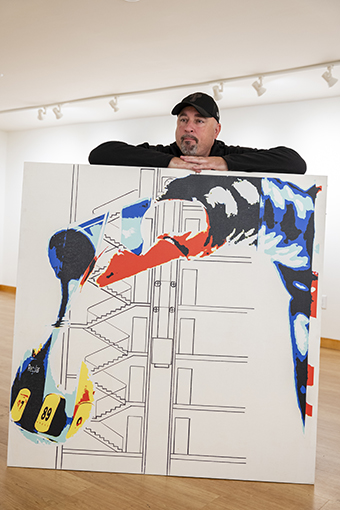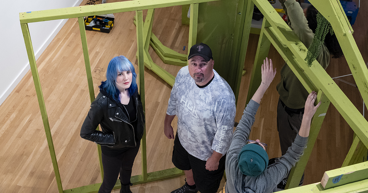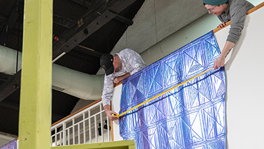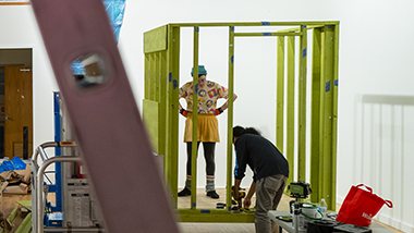 A visitor walks into Moravian University’s Payne Gallery on a Saturday afternoon in October to find installation artist Neill Catangay drilling into chartreuse-painted wood, building the framework for what appears will be a room or a tiny house. From the second tier of the gallery, artist Ashley Garner drapes symmetrical quilts—two wings sewn from shimmering, iridescent fabric in colors that shift from greens to blues to violets when viewed through changing light and perspectives. They nearly touch the floor. Against the wall along the perimeter of the main floor lean paintings and prints waiting to be hung.