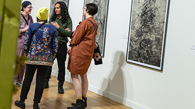 Opening night brought students, staff, faculty, and visitors from the Lehigh Valley and Philadelphia to the show. Drinks and hors d’oeuvres in hand, people meandered around the main exhibit space, climbed the stairs to the upper level, and stepped down into the permanent gallery, stopping to contemplate a piece or talk with the artists about their work.