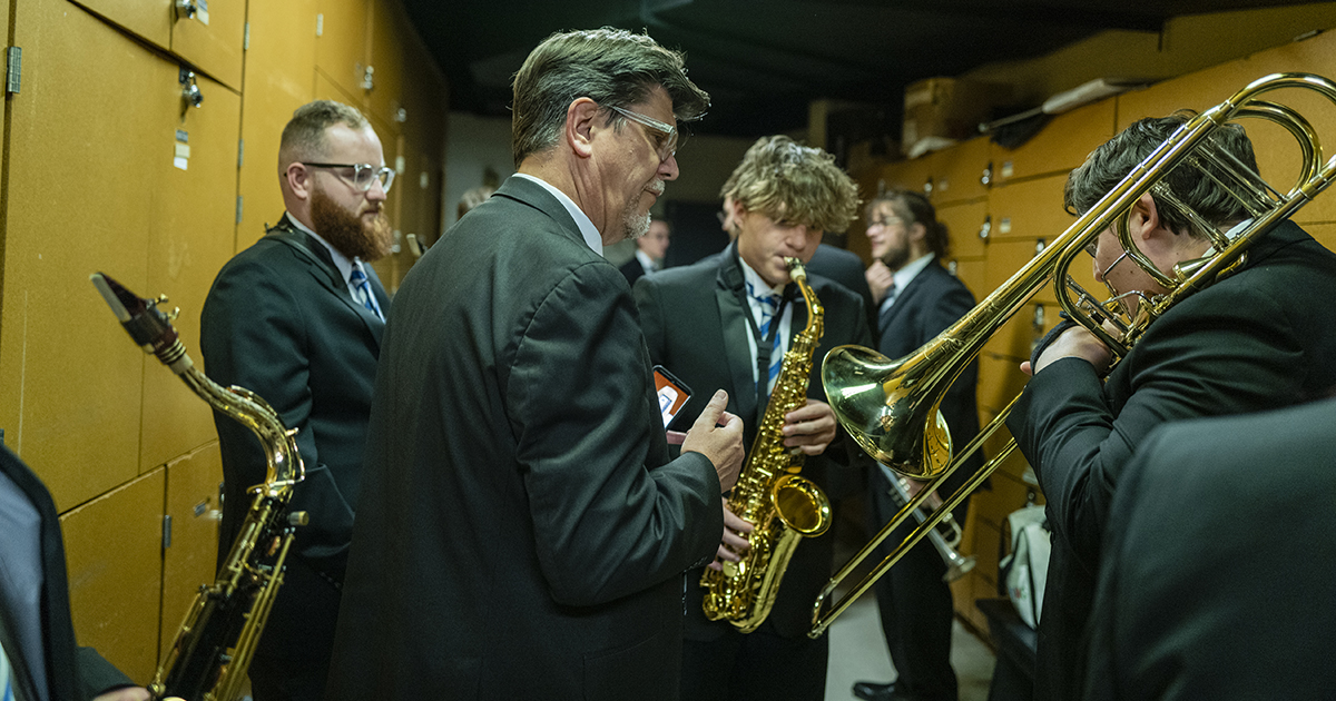 What makes the band’s accomplishments this year even sweeter is the challenge that came before. For more than a year, COVID made rehearsals difficult and live performances impossible. Rehearsals took place outside under a tent, with students lugging instruments and equipment in and out. The horn players wore masks with slits for their mouthpieces, and the instruments were fitted with filters and thick bell covers to contain the virus in case a student was infected.