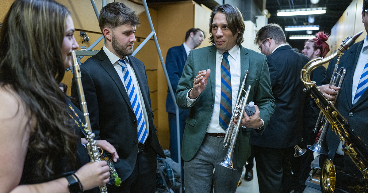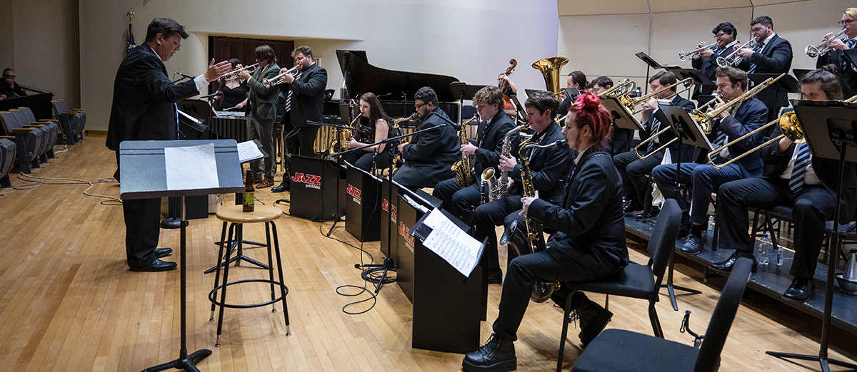 In November, the band gave its fall performance at Foy Concert Hall, playing works by Chick Corea and Miles Davis, among others, and including arrangements by special guest artist Alex Meixner. Born and raised in Allentown, Meixner is a world renowned multi-instrumentalist specializing in the accordion whose music blends elements of jazz, polka, and pop. He was nominated for a Grammy Award in 2007 and was recently inducted into the International Polka Hall of Fame.