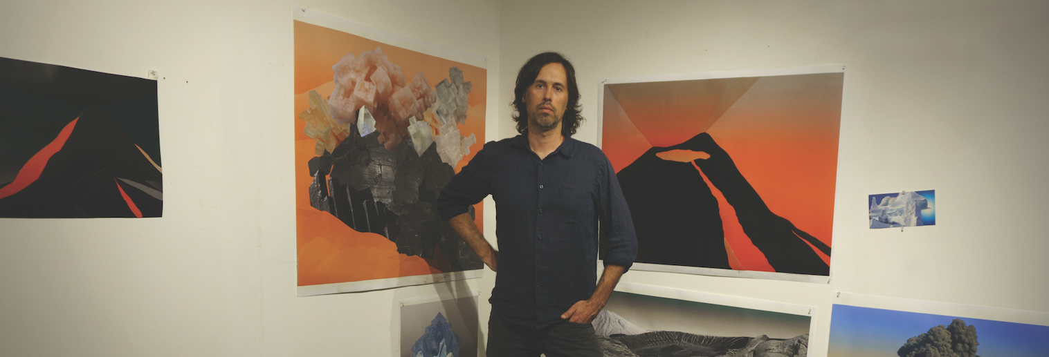 Many of Higgins’s latest pieces depict volcanoes erupting or icebergs melting—natural and unnatural forces.
