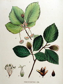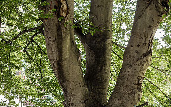 In front of the mighty white oak outside Borhek Chapel stands one of two copper beeches donated to Moravian in 1920 by J. Taylor Hamilton, president of the college from 1918 to 1928, who held a keen interest in Moravian’s tree landscape. The beech gets its common name from the copper sheen of its leaves. Its smooth, thin bark served as an invitation for students to carve their initials in the tree. That mischief was stopped decades ago, but you can see several of those carvings today.