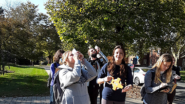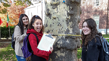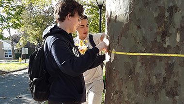 Biology faculty take their students to the classroom of the outdoors. In the ecology course taught by Daniel Proud, assistant professor of biology, students engage in a variety of hands-on, field-based activities. Every fall, students spend an afternoon with Bartlett Tree Experts of Emmaus, Pennsylvania, who introduce them to arboriculture, guide them through the process of creating the campus tree inventory, and teach them how to assess tree health. In addition, Randy Haffling, assistant director of grounds and logistics, meets with students to explain the importance of maintaining healthy soil, as well as the many factors involved in managing the campus grounds. The aim of these hands-on, engaging, field-based learning experiences is to encourage students to connect with the natural world and to inspire a passion for environmental stewardship.