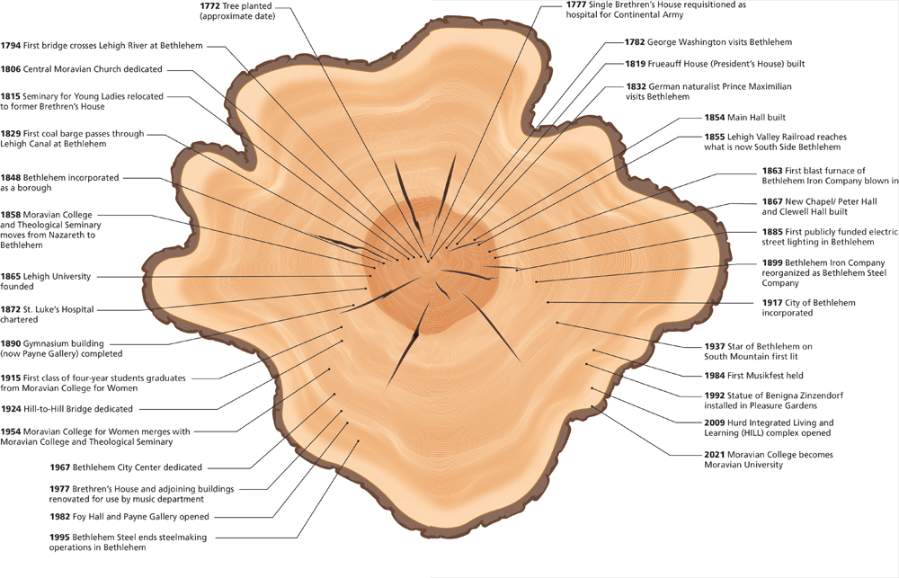 Moravian's English elm has stood behind Brethren's House for roughly 250 years, possibly longer, making it the oldest English elm in the United States. It has "witnessed" a huge chunk of the history of Bethlehem and Moravian. The illustration of its imagined rings here highlights some of the key events that occurred near and around the tree during its lifetime.