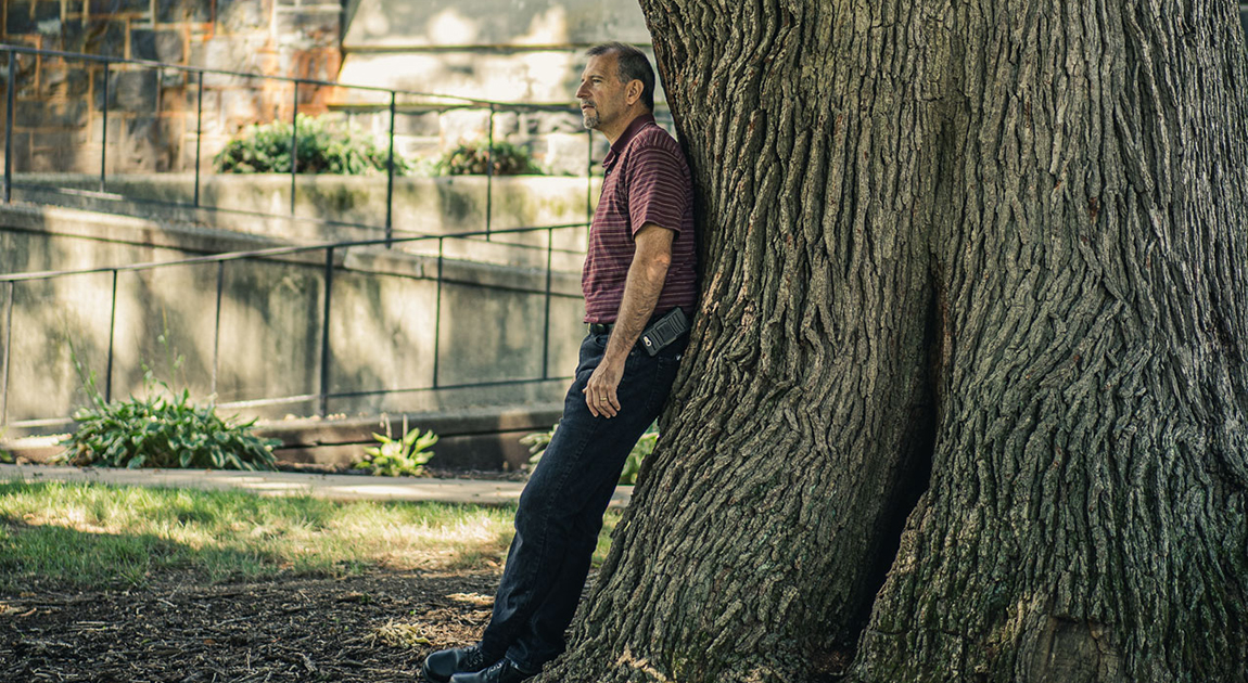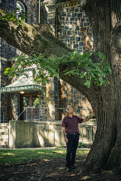 Among other responsibilities, Randy Haffling, assistant director of grounds and logistics, oversees the care of Moravian University’s trees. Haffling (pictured at right with the white oak in front of Borhek Chapel) has degrees in ornamental horticulture and environmental design and holds a certificate in historic preservation and conservation. He owned a landscape design and maintenance business and served as a senior landscape designer for several design and build companies before coming to Moravian. Perhaps what most qualifies Haffling for his work is his deep respect and love of the environment, which is palpable anytime you walk the campus with him as he points out plants and trees, describes their characteristics, and tells their stories. Haffling explains the strategies his team employs to maintain the health of our trees: