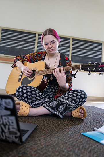 Young writes out the melody and then sketches the shape of the piece—what the peak should sound like, whether she will follow a storyline. Next she focuses on the harmony and rhythms, combining period and modern musical sensibilities and techniques, working out her piece on the guitar before transitioning to music composition software.