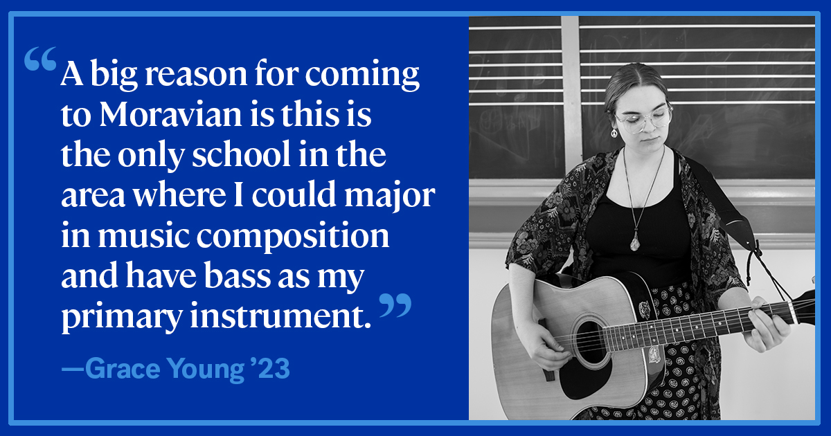 “It was extremely difficult to select from such a strong pool of applicants,” says Rogerson. Finally, he chose eight pieces, including those from a composer-in-residence with the Philadelphia Orchestra, a doctoral candidate in music composition at the Curtis Institute, and two music composition majors from Moravian—Grace Young ’23 and Ryan Anderson ’25.
