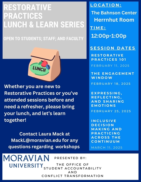 All sessions will be from Noon-1 pm on their respective dates in the Herrnhut Room in the Bahnson Center.